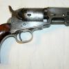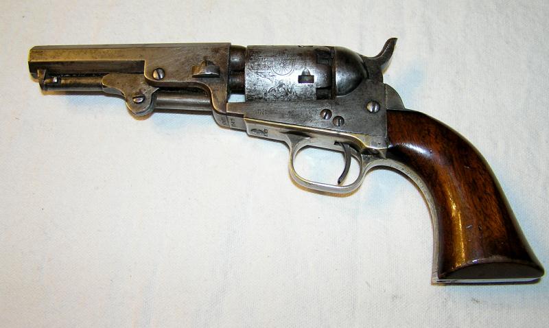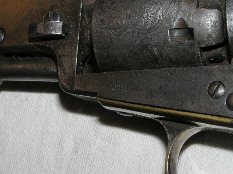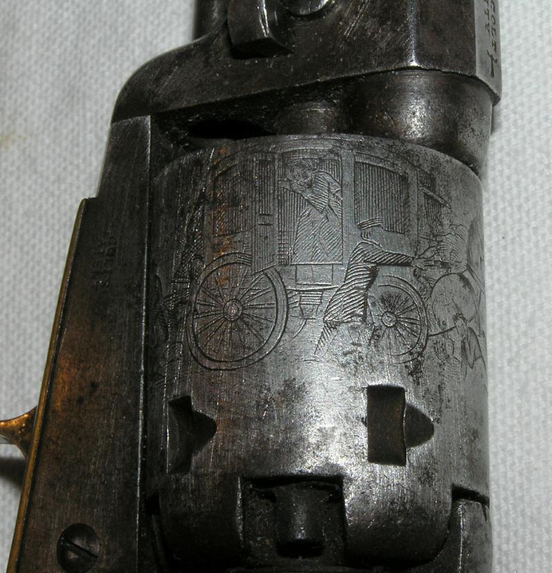 The cylinder of this pistol features an engraved stagecoach scene. Retains 95% original cylinder scene. NYC address marked on top of the barrel. Barrel measures 4" in length. The barrel, frame and cylinder have been cleaned to a medium gray finish. The backstrap retains about 50-60% original nickel plating. All matching serial numbers, #83435 including wedge pin. The grips are in excellent condition with 90% original varnish. Mechanically in good condition, functions well.