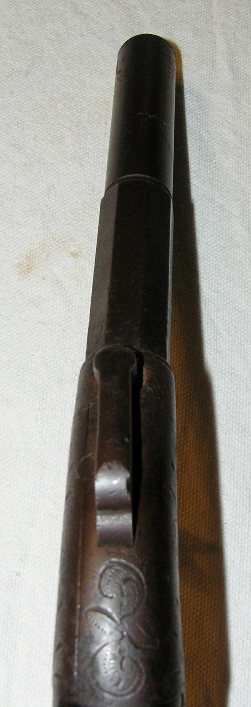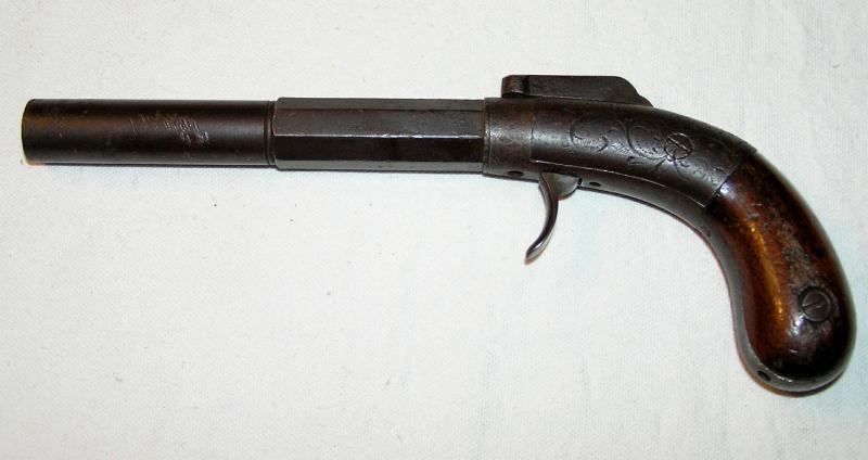 Marked "Bacon & Co, Norwich, Ct." This gun has a part octagon, part round barrel. The frame and backstrap are lightly engraved. The gun is covered with an overall brown patina. Moderate pitting around nipple area. The grips are in fair condition with some dings and scratches. 50% original finish on the grips. Functions perfectly.