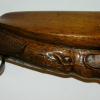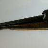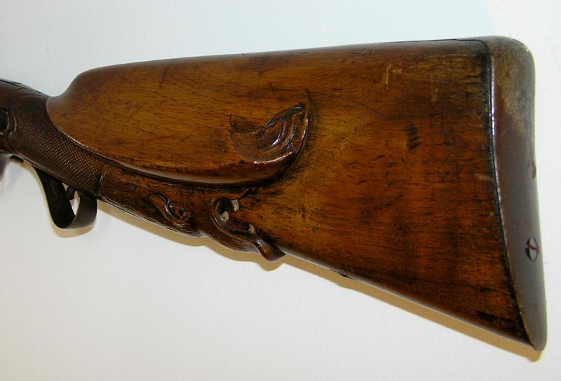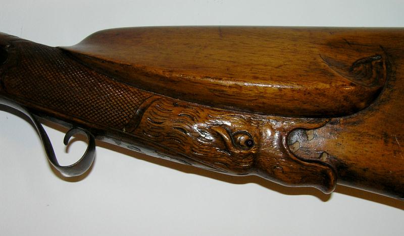 This shotgun features a large carved boars head with ruby eyes and painted teeth on the butt stock. The wood is in very good condition. The damascus barrels are dark brown in color and have light pitting at the breach. It has matching hammers, the nipples are broken. The right lock is in good working order, the left lock need repair.