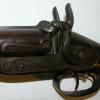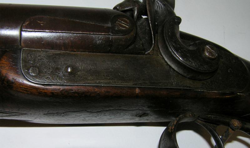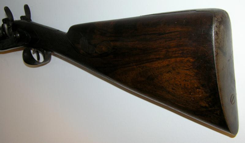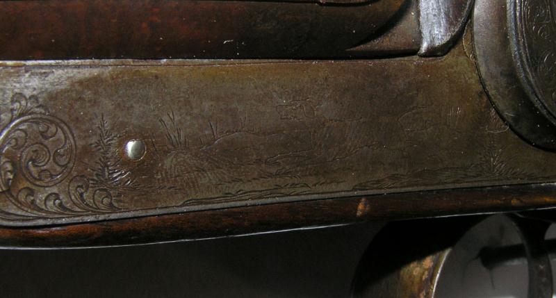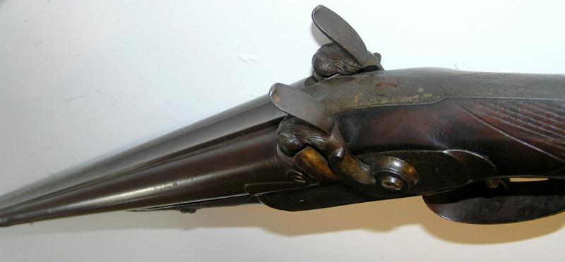 Double barrel percussion with figural dog head hammers. It has engraved dogs on the both lock plates, checkering at the wrist and fore end, lightly engraved tang on butt plate. The ram rod has been replaced, barrel measures 34". High qualtiy European gun with good bores, brown patina, and in mechanically excellent condition.