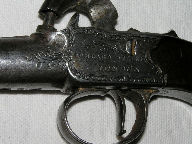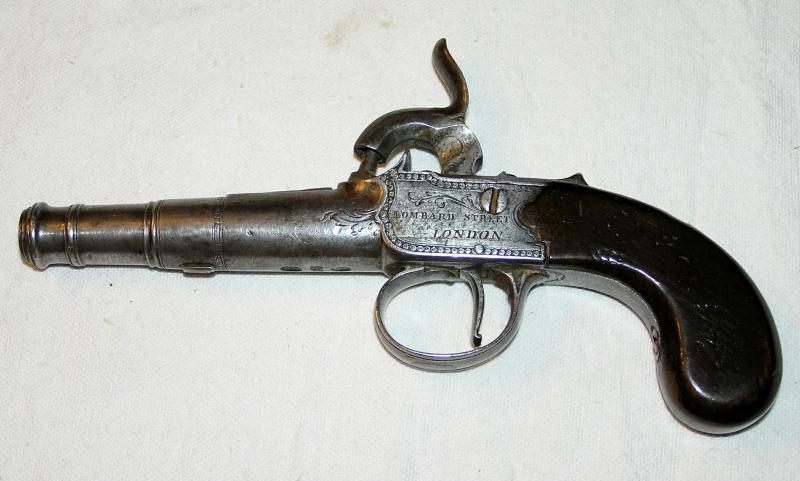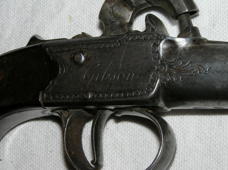 Marked "Gibson, Lombard Street, London" on the frame. British proofs on the barrel in front of the trigger guard. Period conversion from flintlock to percussion. Screw barrel with front 2" removeable. The grips are in excellent condition retaing 95% original varnish. In good mechanical condition.