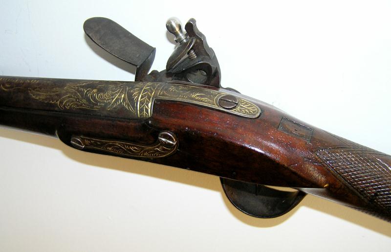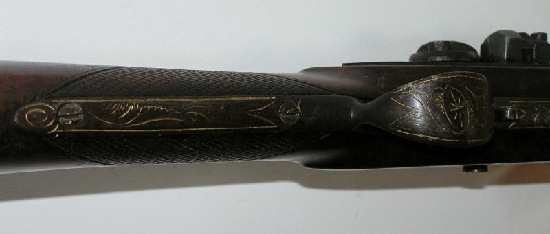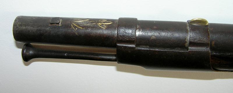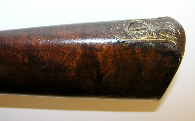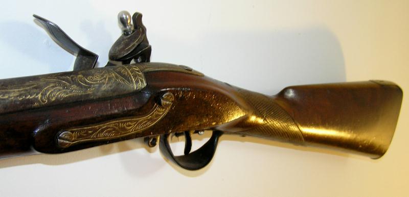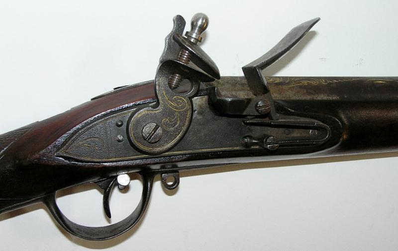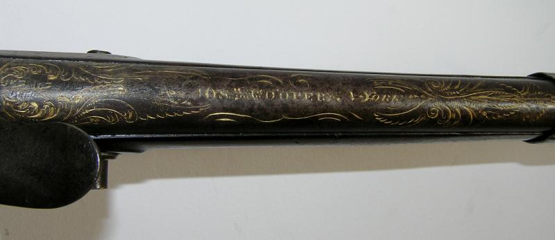 1840s Militia Officer’s 70 caliber private purchase flintlock musket by maker Joseph Cooper, NY. This musket is extensively engraved and gold etched on the barrel, trigger guard, tang on butt plate and lock plate. The gun is good working order with the original ram rod. The top jaw hammer screw has been replaced.