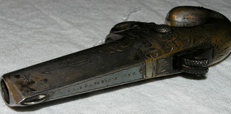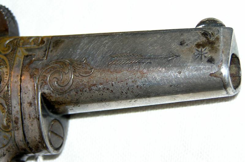 Factory engraving on barrel and frame. The barrel retains 90% of it's original nickel plating. The frame has about 20% original nickel plating. Nice patina on brass. Good mechanical condition.