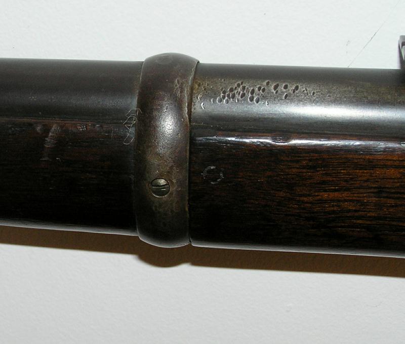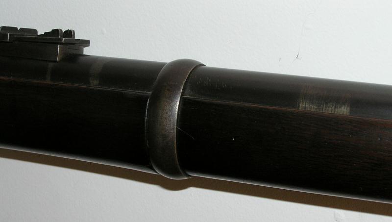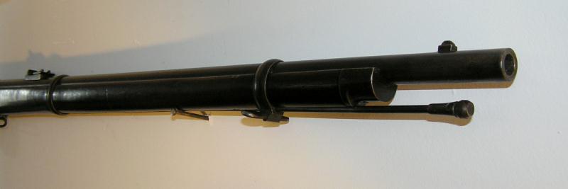 The receiver is original blue with the barrel turning plum brown. The bore is bore. There is a small patch of dings on the barrel. The original ram rod is present.