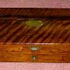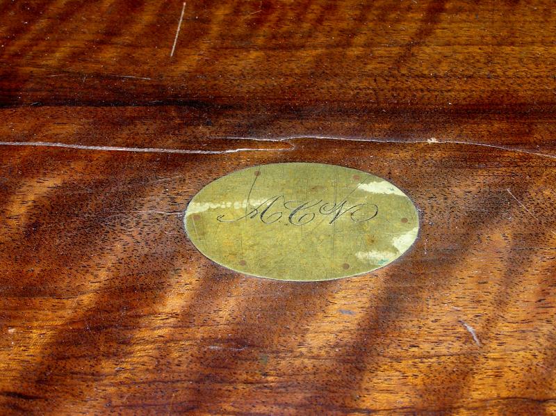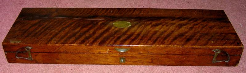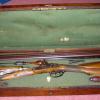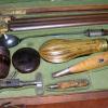 Youth's percussion shotgun with .50 bore. Case set includes cleaning rod, ladle, patch box, oiler, powder flask, 3 barrel cleaning brushes, spring retention devises, percussion cap barrel and screwdriver. The shotgun is made in Belgium. Walnut box with monogramed brass name plate on front.